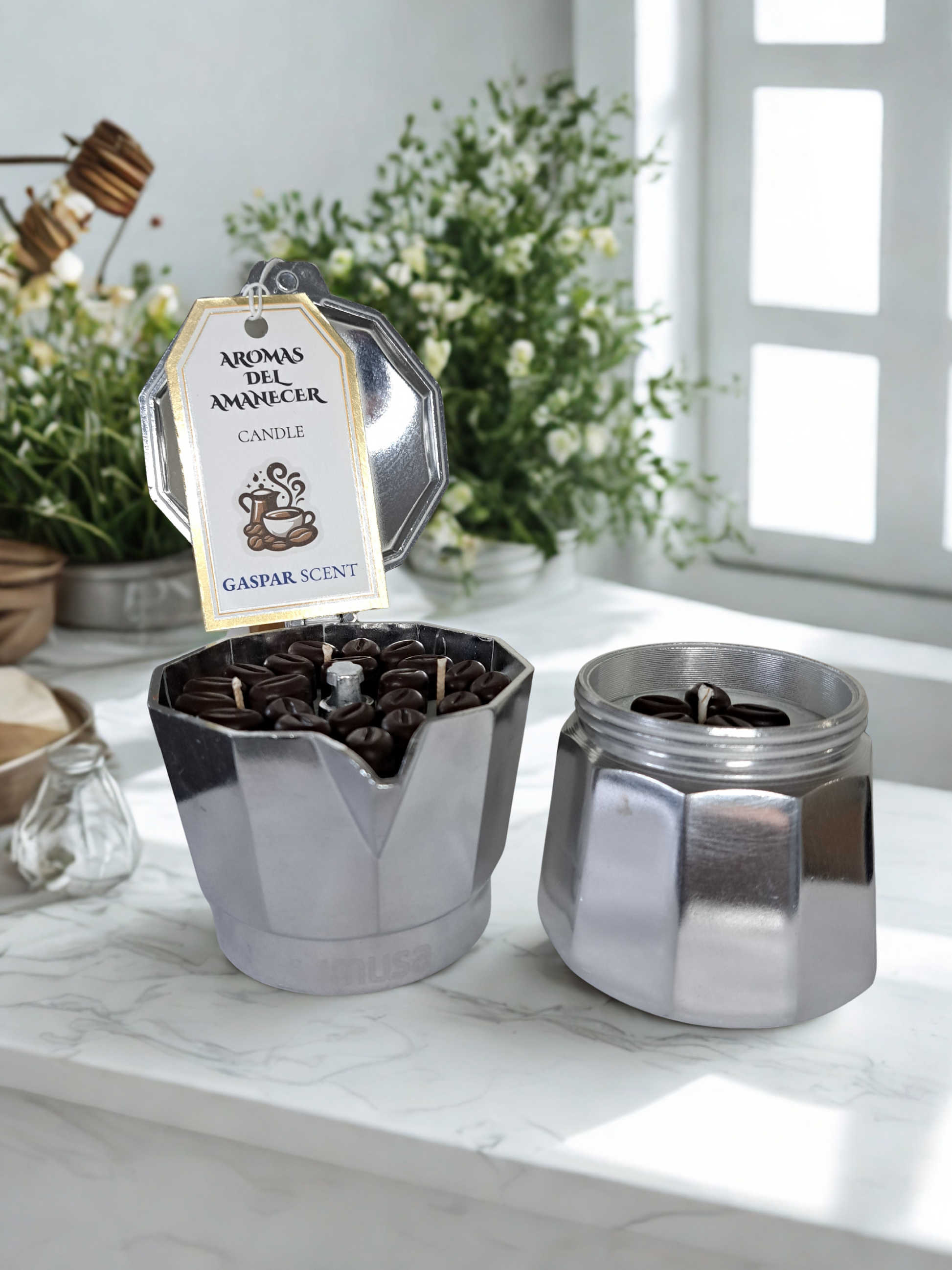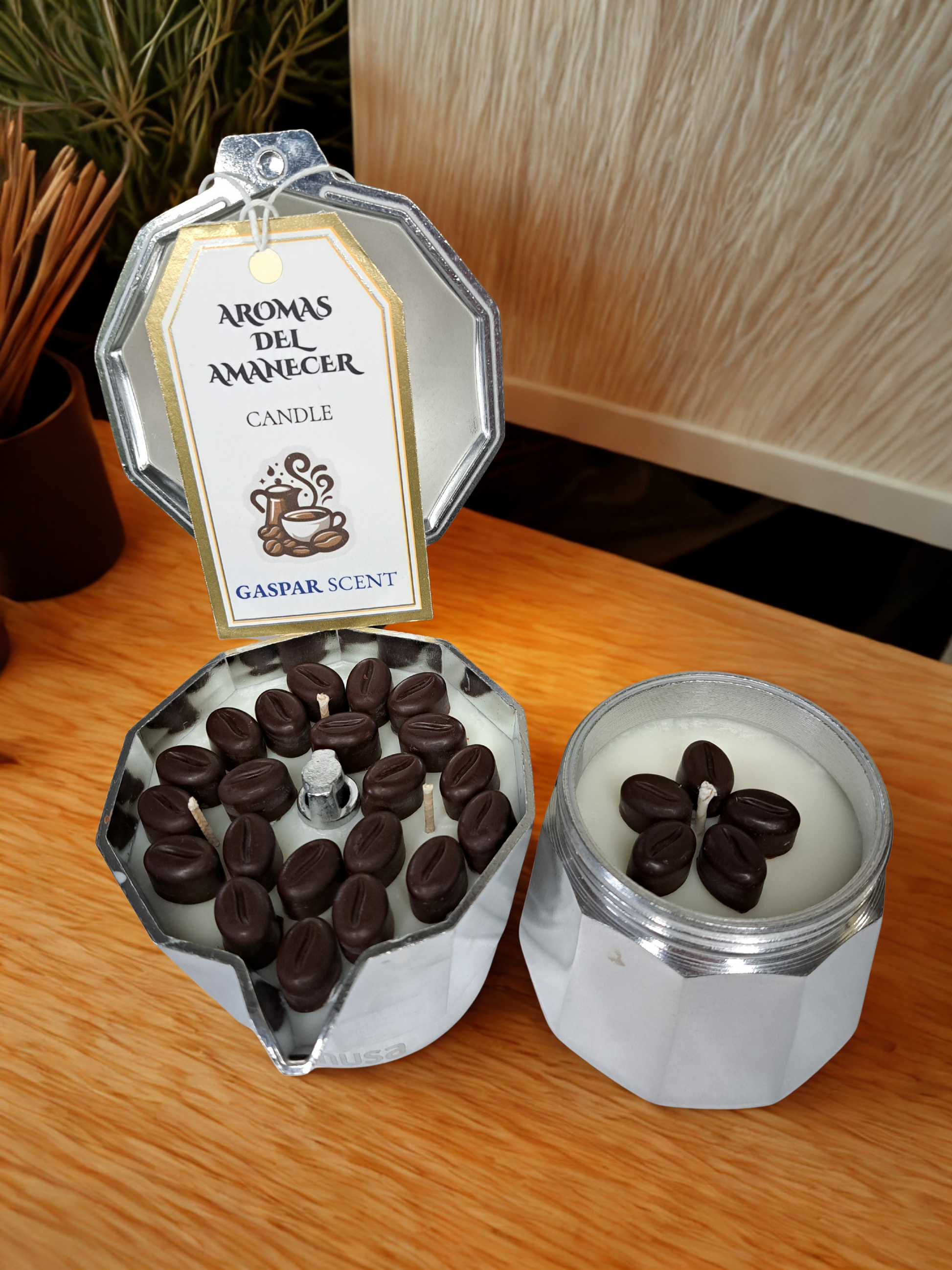 Despierta tus sentidos con esta exclusiva vela elaborada a mano dentro de una auténtica cafetera espresso. "Aromas del Amanecer" recrea la experiencia de un coffee shop con notas envolventes de café recién molido, crema caliente y un toque sutil de vainilla tostada.