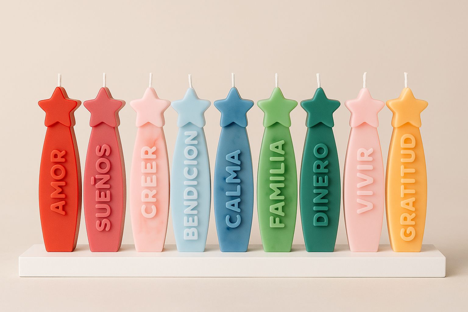 Cada una de estas velitas está diseñada para recordarte lo que realmente importa: Amor, Sueños, Fe, Calma, Familia, Gratitud y más.